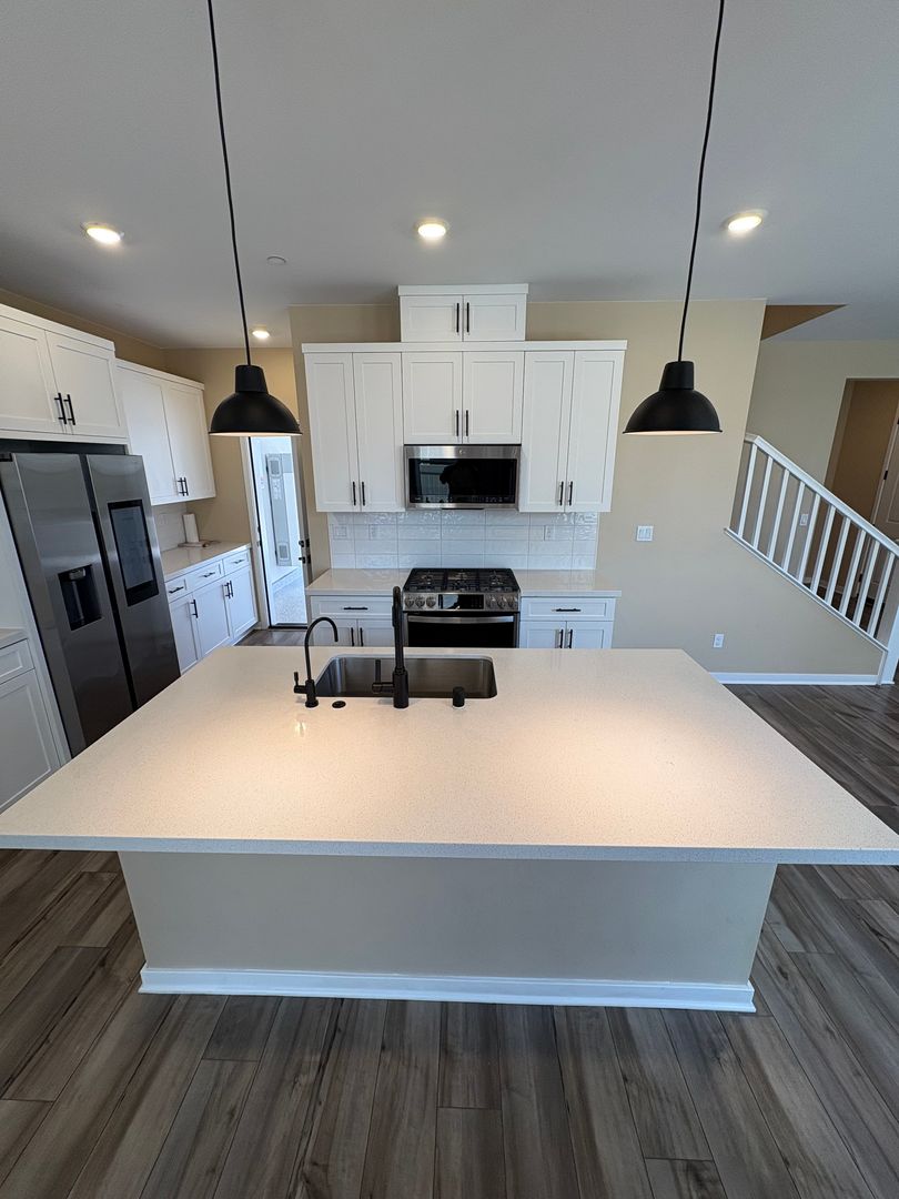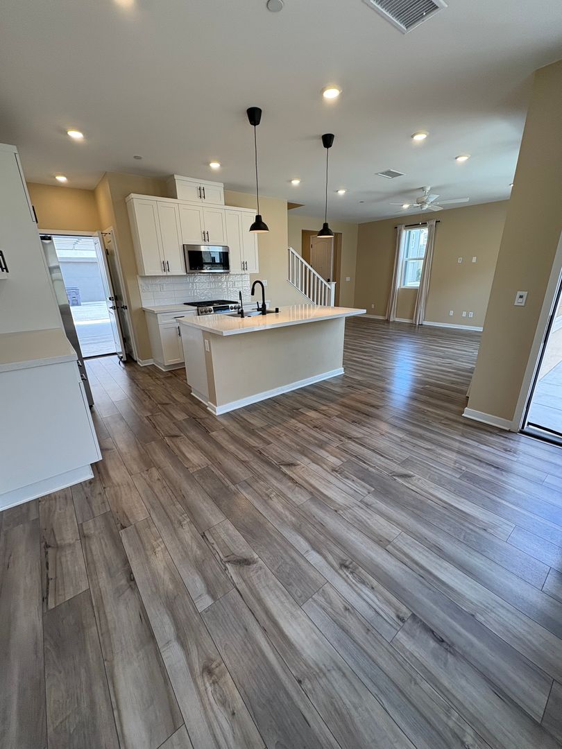 This thoughtfully upgraded home features a bright open floor plan with white cabinetry, marble countertops, and a spacious kitchen island, perfect for cooking, entertaining, or gathering with family and friends. The home comes fully equipped with appliances including a smart refrigerator, washer, and dryer making move-in easy and convenient.